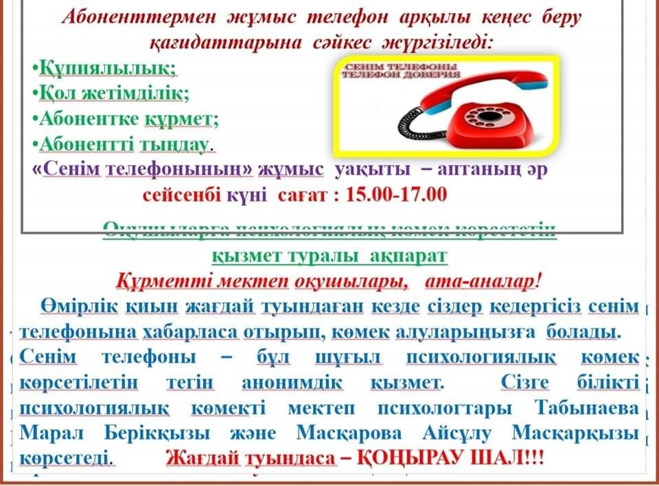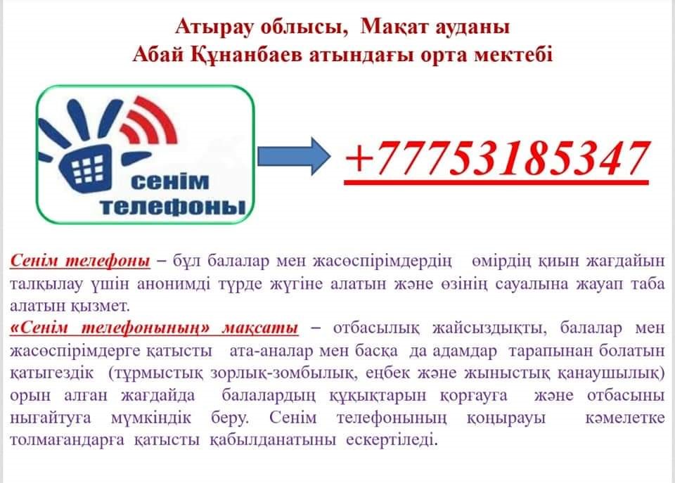 Атырау облысы Білім беру басқармасының Мақат аудандық білім бөлімі "Абай Құнанбаев атындағы орта мектебі" КММ. Ата-аналар мен окушылардың назарына! Мектебімізде сенім телефоны +77753185347 жұмыс жасайды. «Сенім телефонының» мақсаты – отбасылық жайсыздықты, балалар мен жасөспірімдерге қатысты ата-аналар мен басқа да адамдар тарапынан болатын қатыгездік (тұрмыстық зорлық-зомбылық, еңбек және жыныстық қанаушылық) орын алған жағдайда балалардың құқықтарын қорғауға және отбасыны нығайтуға мүмкіндік беру. Сенім телефонының қоңырауы кәмелетке толмағандарға қатысты қабылданатыны ескертіледі. Сіз педогог-психологтардан пайдалы ақпарат алғыңыз келсе, бізге қоңырау шалыңыз!