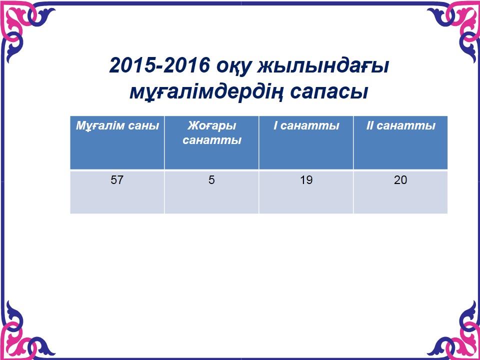 Абай Құнанбаев атындағы орта мектебіндегі мұғалімдердің сапалық құрамы туралы мәлімет 2019-2020