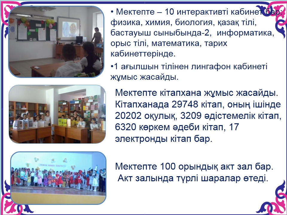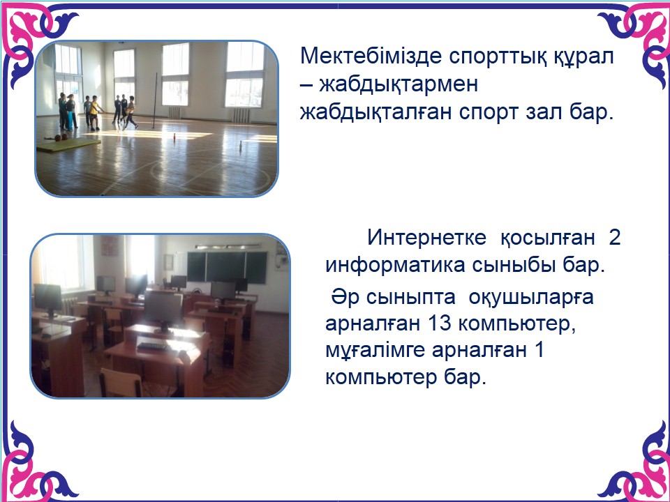 Барлық саны-13 Бастауыш сынып-3 Физика-1 Математика-1 Орыс тілі-1 Қазақ тілі -1 Информатика-1 Химия-1 Химия лаб.-1 География-1 Биология-1 Тарих-1 |
