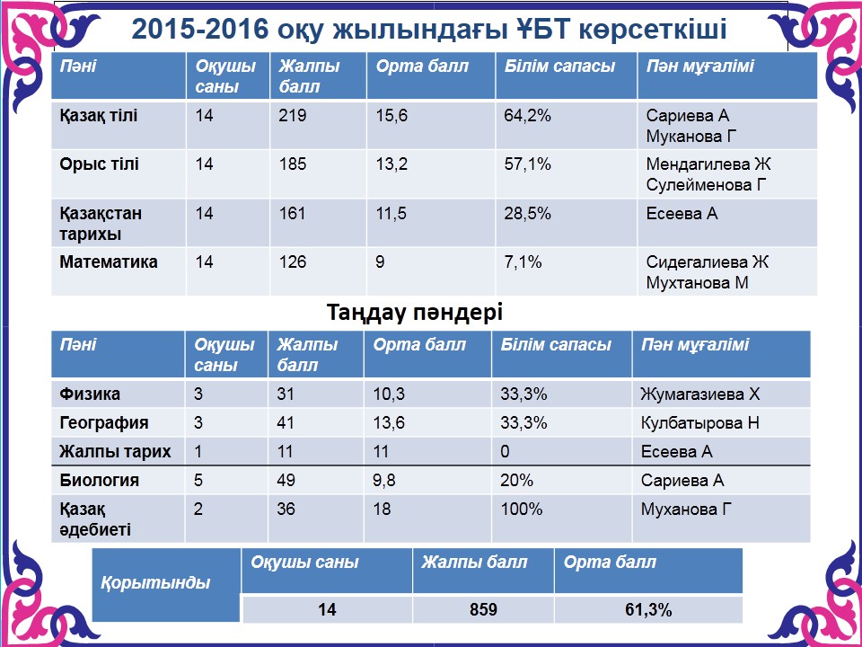 Басшылық-3 Ж.Мендигалиева А.Сариева Ж.Жумашева Г.Хайруллина Үйлестіруші-2 А.Утепкалиева Г.Муканова Базалық-8 Ж.Сидегалиева Х.Тигиспаева Г.Бекешева А.Алпысова А.Муханова Б.Дуйсалиева Х.Жумагазиева
