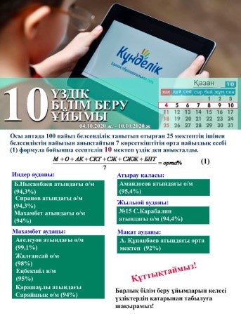 13.10.20ж – Атырау облысы, Мақат ауданы, Доссор кенті Абай Құнанбаев атындағы орта мектебі 4-10 қазан аралығында Kundelik.kz электронды журналын уақытылы толтырушы және белсенді қолданушы болып облыс бойынша алғашқы 10 үздік білім беру ұйымының қатарынан