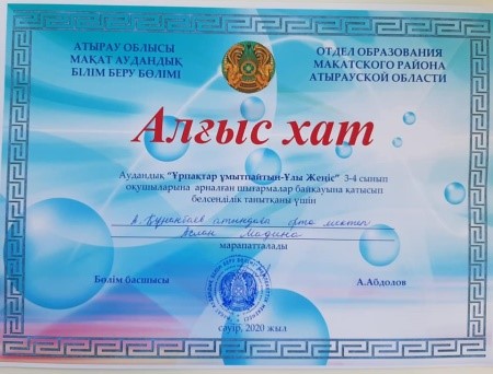 13.10.20ж – Атырау облысы Мақат аудандық білім беру бөлімінің ұйымдастыруымен өткен "Ұрпақтар ұмытпайтын -Ұлы Жеңіс" шығармалар байқауында Абай Құнанбаев атындағы орта мектебінің оқушысы Аслан Мадина Алғыс хатпен марапатталды. Құттықтаймыз!