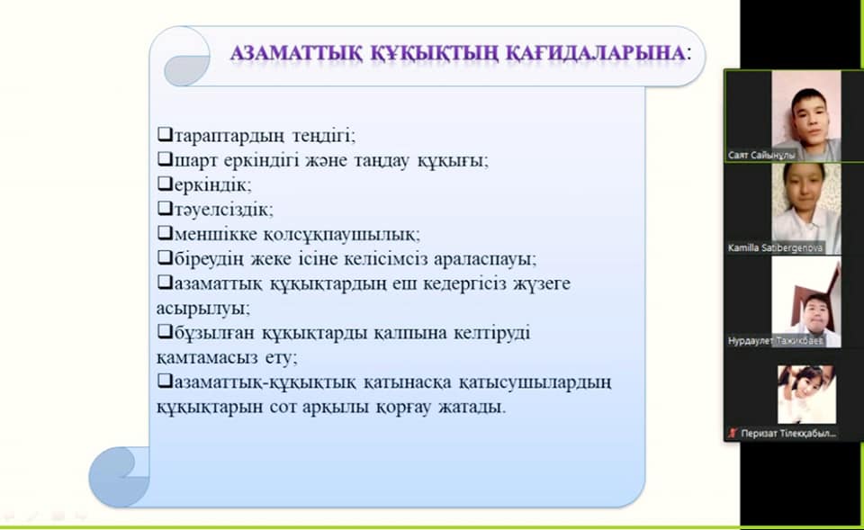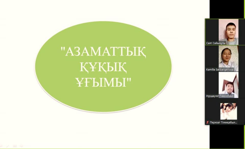 22.10.20ж - Атырау облысы Мақат ауданы Доссор кенті Абай Құнанбаев атындағы орта мектебінің 10 "А" сыныбында "Азаматтық құқық ұғымы" тақырыбында сынып сағаты өткізілді.