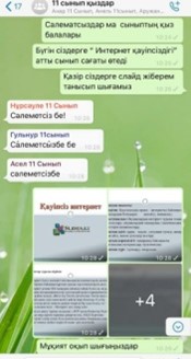 04.11.20ж - "Рухани жаңғыру" бағдарламасы аясында әзірленген "Дәстүр мен ғұрып" жобасына сәйкес Атырау облысы Мақат ауданы Доссор кенті Абай Құнанбаев атындағы орта мектебінде 1-11сынып арналған "GirlSafety" тақырыбында қыздарға арналған интернет қауіпсіздігі сынып сағаттары ұйымдастырылды.