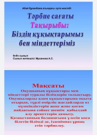 15.11.20ж - Атырау облысы,Мақат ауданы,Доссор кенті Абай Құнанбаев атындағы орта мектебінде 1989 жылғы 20 қарашадағы қабылданған Бала құқықтары туралы ББҰ Конвенциясының негізгі ережелері туралы, өзіне жүктелген міндеттерді орындай білуге үйрету мақсатында 9 "Ә" сыныбында "Біздің құқықтарымыз бен міндеттеріміз" тақырыбында қашықтықтан сынып сағаты ұйымдастырылды. Сынып жетекшісі: Мұханова А.С.