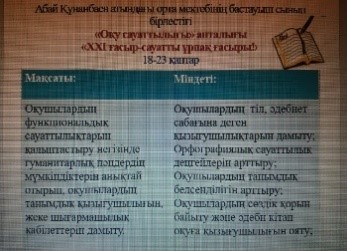 19.01.21ж – Атырау облысы, Мақат ауданы, Доссор кентіндегі Абай Құнанбаев атындағы орта мектебінде бастауыш сынып бірестігі оқушылардың функциональдық сауаттылықтарын қалыптатыру негізінде гуманитарлық пәндердің мүмкіндіктерін анықтай отырып, оқушылардың танымдылық қызығушылығын, жеке шығармашылық қабілеттерін дамыту мақсатында "ХХІ ғасыр-сауатты ұрпақ ғасыры!" атты "Оқу сауаттылығы" апталығы ұйымдастырылуда.