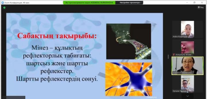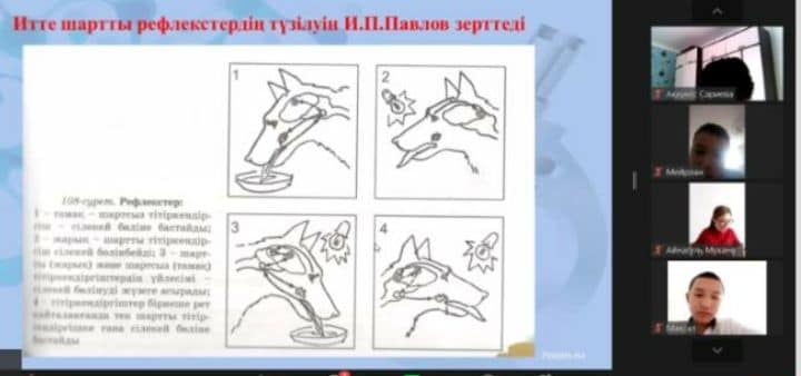 26.02.21ж - Атырау облысы, Мақат ауданы, Доссор кенті Абай Құнанбаев атындағы орта мектебінде "Жаңартылған біліммен болашаққа" тақырыбында биология, химия және география онкүндігі барысында 7 "б" сыныбына "Мінез-құлықтың рефлекторлық табиғаты: шартсыз және шартты рефлекстер" тақырыбында ашық сабақ болып өтті. Сабақ барысында видеоролик, суреттер көрсетіліп, тақырыпты мұғалім ашып түсіндірді. "Терминдер кестесі" әдісімен оқулықпен жұмыс, LearningApp.org сервисінен тапсырма орындау және биологиялық диктант секілді тапсырмалар орындалды. Сабақ соңында кері байланыс алынды. Пән мұғалімі: Бүркішова Әсемгүл