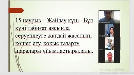15.03.21ж - Атырау облысы, Мақат ауданы, Доссор кенті Абай Құнанбаев атындағы орта мектебінде Қазақстан Республикасы Тәуелсіздігінің 30жылдық мерейтойына орай OTANLife жобасы аясында 15 наурыз - Жайлау күніне орай "Жайлау жайлай білмеген, малды айдай білмейді"тақырыбында 7 "а" сыныбында қашықтықтан сынып сағаты өткізілді.