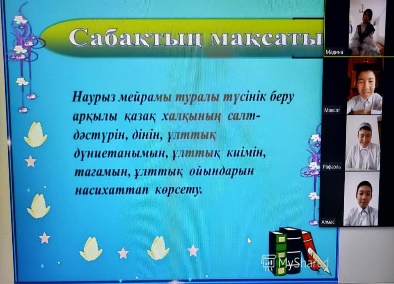 22.03.21ж - Атырау облысы, Мақат ауданы, Доссор кенті Абай Құнанбаев атындағы орта мектебінің 7 "Ә" сыныбында "Наурыз - қазақтың ұлттық мейрамы" тақырыбында тәрбие сағаты ұйымдастырылды.