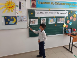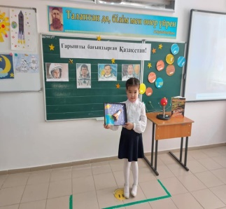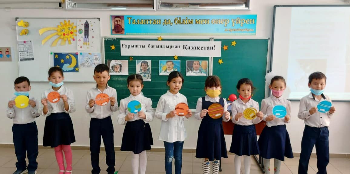 12.04.21ж - Атырау облысы,Мақат ауданы,Доссор кенті Абай Құнанбаев атындағы орта мектебінде 12 сәуір - Ғарышкерлер күніне орай 1 "Ә" сыныбында "Ғарышты бағындырған Қазақстан" тақырыбында сынып сағаты ұйымдастырылды. Сынып жетекшісі: Ғарифоллақызы Р.