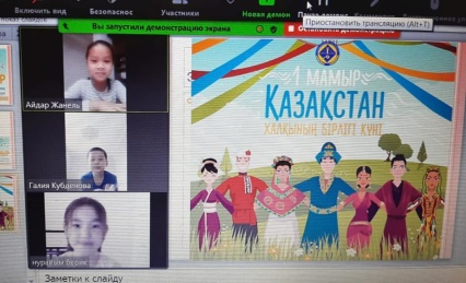 30.04.21ж - Атырау облысы, Мақат ауданы, Доссор кенті "Абай Құнанбаев атындағы орта мектебі" КММ 1 мамыр-Қазақстан халықтарының бірлігі күніне орай 2 "Ә" сыныбында "Ынтымағы жарасқан туған өлкем - Қазақстан!" тақырыбында онлайн тәрбие сағаты ұйымдастырылды.