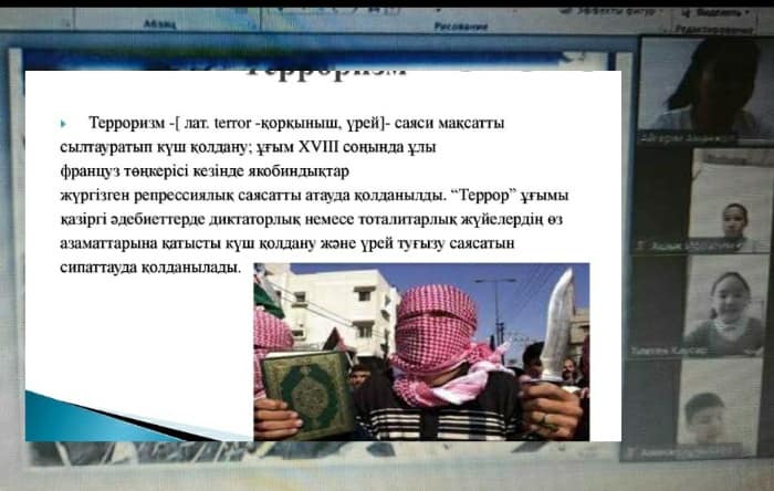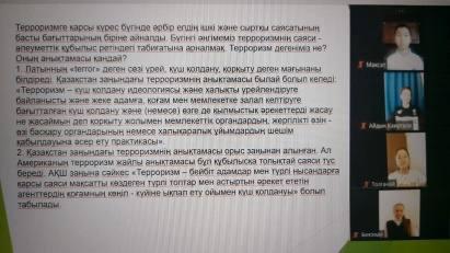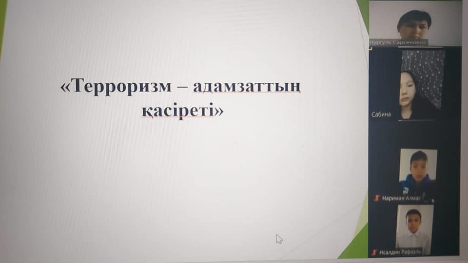 22.04.21ж - Атырау облысы, Мақат ауданы, Доссор кенті Абай Құнанбаев атындағы орта мектебінде оқушыларға экстремизм,терроризм туралы терең түсінік беру, оның түрлері, себептері мен зардаптарын ұғындыру, жасөспірімге қоғамның әлеуметтік, құқықтық, діни сипаттарын ұғындыра отырып, оларды террорлық, лаңкестік және діни экстремистік бағытта арандатуға жол бермеу, жасөспірімдерге бейбітшіліктің маңызын және мейірімділік пен ізгіліктің, адамдарға жақсылық жасай білудің өмірдегі басты ұстанымы екенін ұғындыру мақсатында сынып сағаттары, түсіндірме жұмыстары жүргізілді.