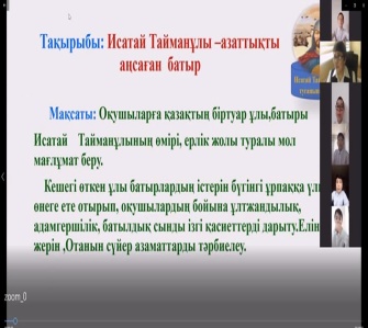 20.04.21ж - Атырау облысы, Мақат ауданы, Доссор кенті "Абай Құнанбаев атындағы орта мектебі" КММ Исатай Тайманұлының туғанына 230 жыл толуына орай "Исатай Тайманұлы- азаттық жолындағы күрескер" тақырыбында 3 "Ә" сыныбында сынып сағаты ұйымдастырылды.