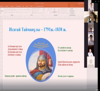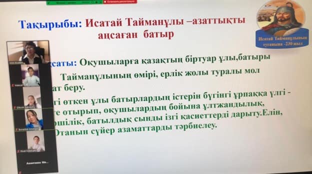 20.04.21ж - Атырау облысы, Мақат ауданы, Доссор кенті "Абай Құнанбаев атындағы орта мектебі" КММ Исатай Тайманұлының туғанына 230 жыл толуына орай "Исатай Тайманұлы- азаттық жолындағы күрескер" тақырыбында 3 "А" сыныбында сынып сағаты ұйымдастырылды.